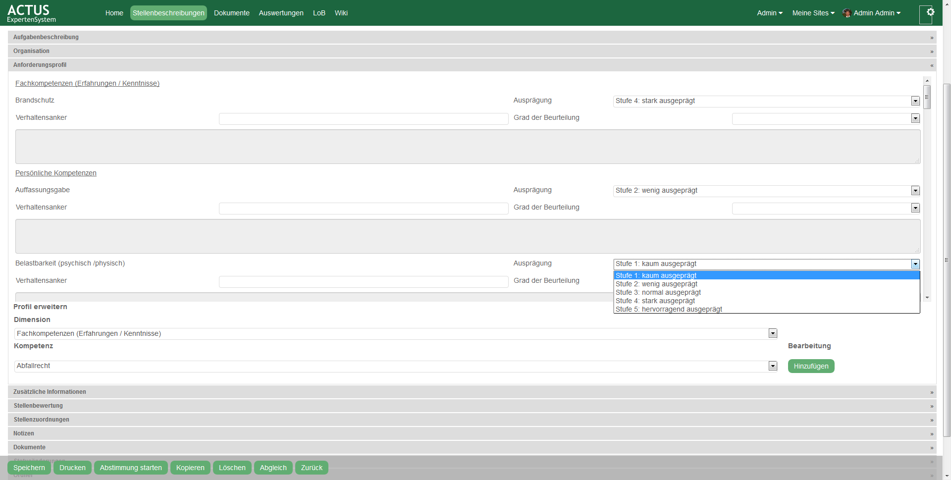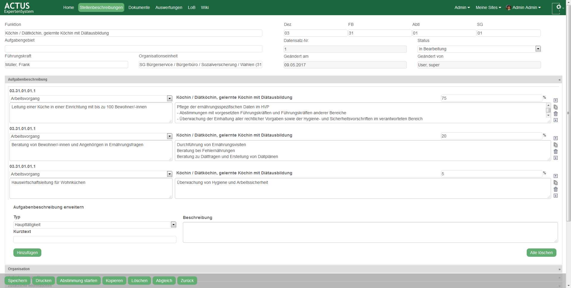 Mithilfe des ACTUS-ExpertenSystems kommen Sie in nur wenigen Schritten zu umfassenden und betriebsspezifischen Aufgaben- und Stellenbeschreibungen. Damit schaffen Sie für Ihre Mitarbeiter klar umrissene Handlungs- und Entscheidungsspielräume, vermeiden Kompetenzkonflikte, erleichtern die Stellen-Neubesetzung und legen die Basis für Ihre Organisationsentwicklung via Software. Als Basis für eine gerechte Grundentgeltfindung stellt ACTUS eine Vergleichbarkeit zwischen den unterschiedlichen Stellen, Aufgabenbeschreibungen und Anforderungen sicher.