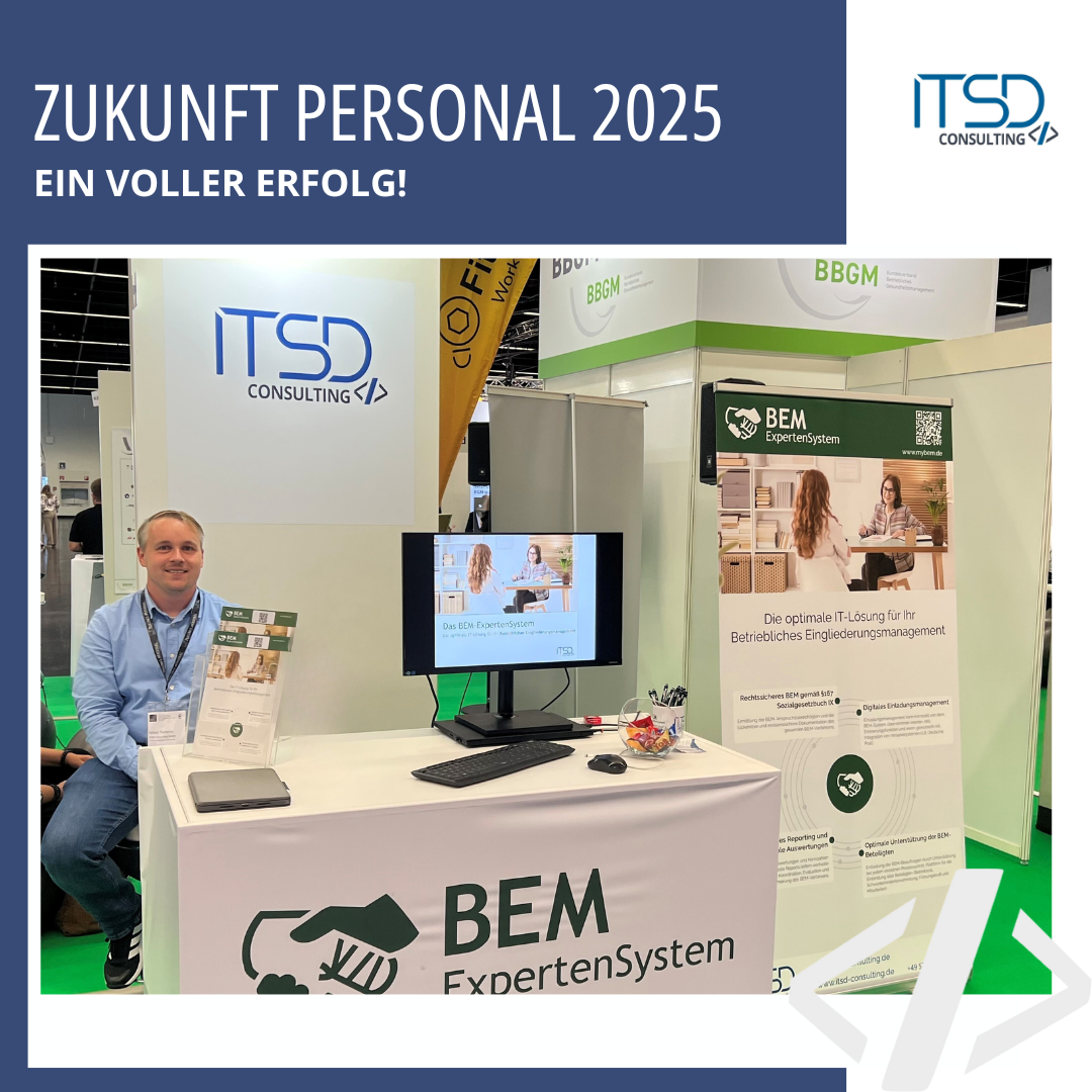 Vom 09. bis 11. September 2025 ist die ITSD Consulting GmbH auf der Zukunft Personal Europe in Köln vertreten. Gemeinsam mit dem BBGM (Bundesverband Betriebliches Gesundheitsmanagement e.V.) finden Sie uns in Halle 5.1 am Stand M.28.